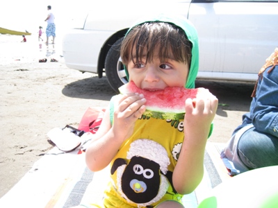 بعد از ظهر روز اول رفتیم لب ساحل و بچه ها شروع به ماسه بازی کردند بعد ایلیا هم که در حالت عادی علاقه چندانی به خوردن بلال ندارد با دیدن جمع با اشتها بلال خورد